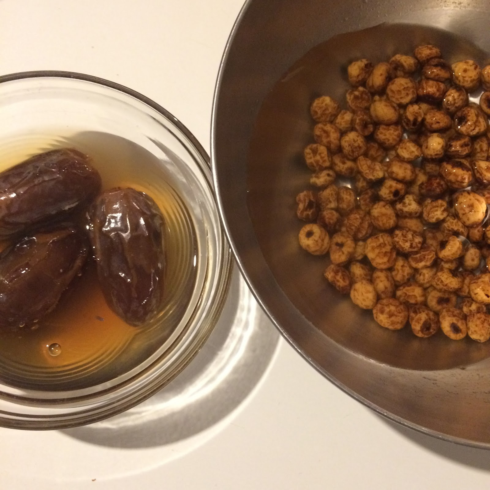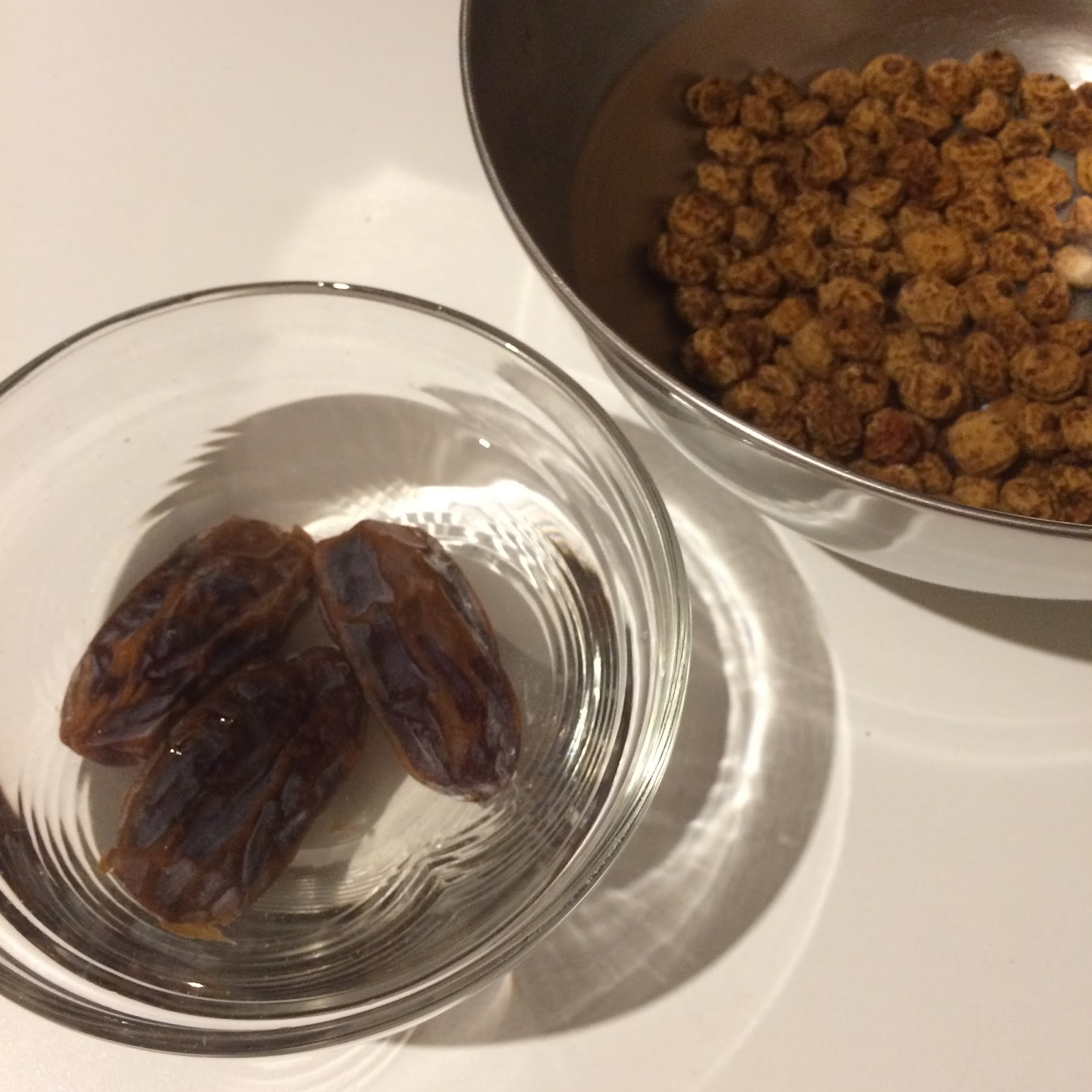 Erdmandeln mindestens 2x mit Wasser abspülen und dann mit reichlich Wasser bedecken, auch die entkernten Datteln ganz mit Wasser bedecken und so mindestens 12 Std (über Nacht) einweichen lassen.
