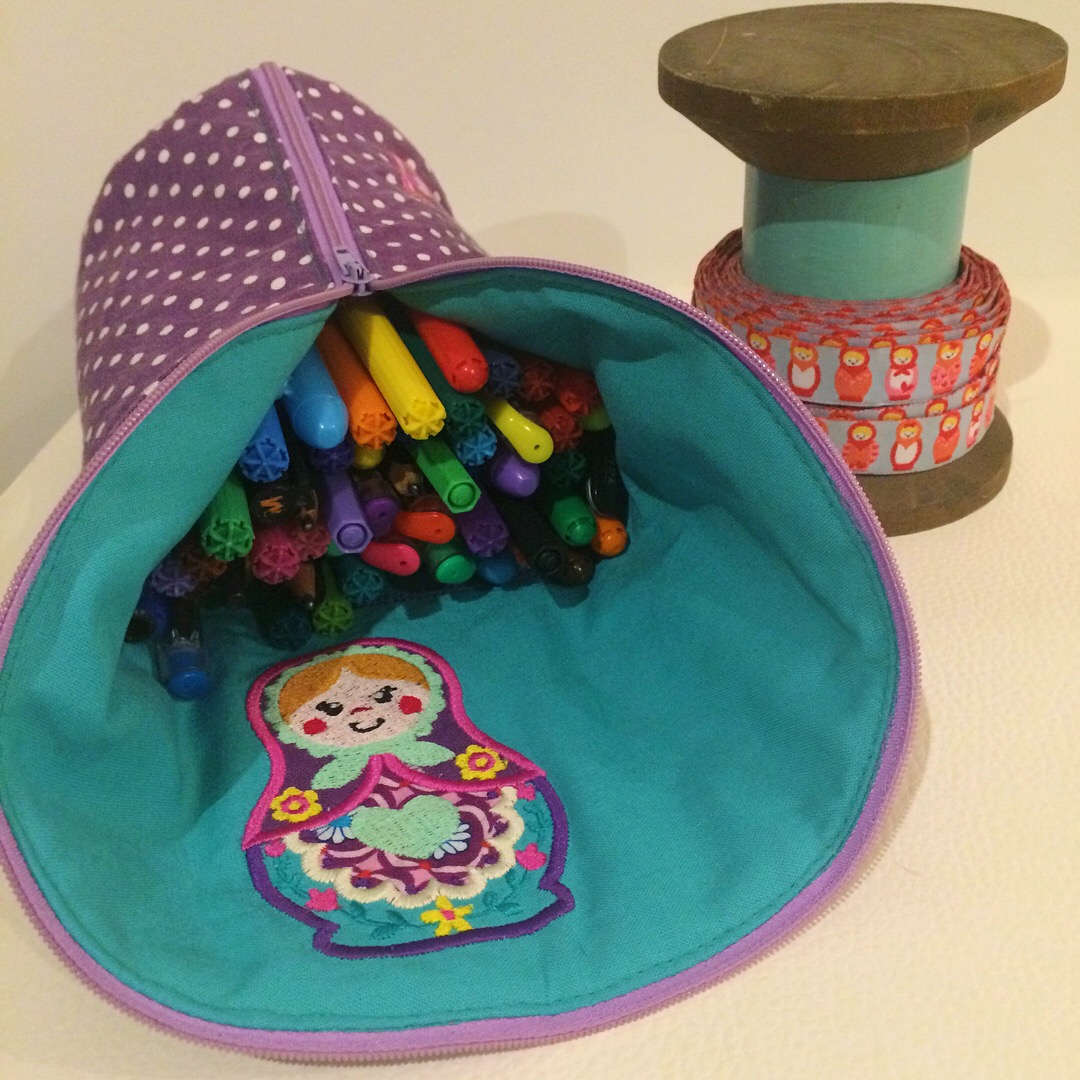 Denn ich habe mir von ein paar Wochen viiiele neue Filzstifte gekauft und die waren in meinem SchminkMäppchen zwischengelagert ? also habe ich etwas auf Pinterest gescrollt und wurde inspiriert vom Stehschlamperl vom Blog:Vergissmainicht ..dort gab es aber nur eine kurze Anleitung ohne Schnittmuster ? also habe ich kurzerhand ein paar Blatt Papier aneinander geklebt und hab‘ mir einfach selber einen Schnitt gezeichnet ? Die passende Stoffkombi sowie Stickmuster waren schnell gefunden. Das zuschneiden ging auch schnell von der Hand, hach.. ich liebe Mäppchen und Etuis ? Die sind immer so schnell fertig und können bewundert werden ? So ein Mäppchen mit nur einer Reißverschlussraupe wollte ich immer schonmal nähen ? und der Taschen-Sew-Along ist ja bekannt dafür, endlich zu nähen, was schon länger auf der To-Sew-Liste steht ? ….und da ja eine Reißverschlussraupe übrig bleibt, werde ich wohl noch eins in Übergröße nähen… Bestickt habe ich mein Stehschlamperl mit einer Matrjoschka und dem Schriftzug Mädchenkram, da ich auch das von meiner “Muss-ich-unbedingt-mal-sticken-Liste“ streichen wolle ?Stickmuster von lollipopsforbreakfast