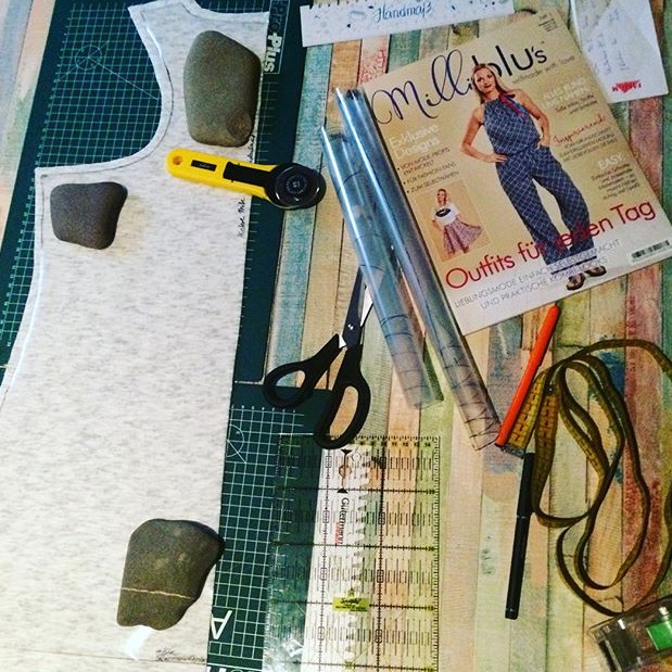 ..zum beschweren meiner Schnitte nehme ich Steine und zum übertragen des Schnittes benutzte ich z Z Bucheinschlagfolie 3m x 0,40m – sehr stabil und auch voll kommend ausreichend für meine Körpermaße ?